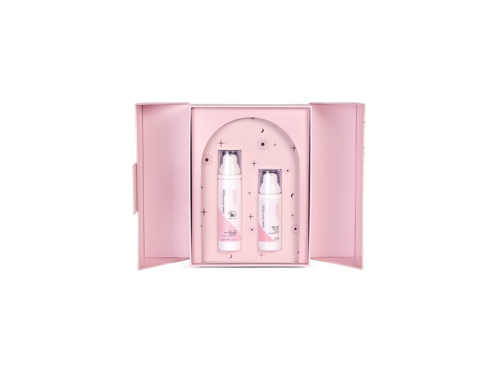 Darčekový set obsahuje Upokojujúce sérum pre skľudnenie precitlivenej a začervenanej pleti a Zjednocujúci tónovací krém SPF50 pre UV ochranu a zjednotenie tónu pleti.