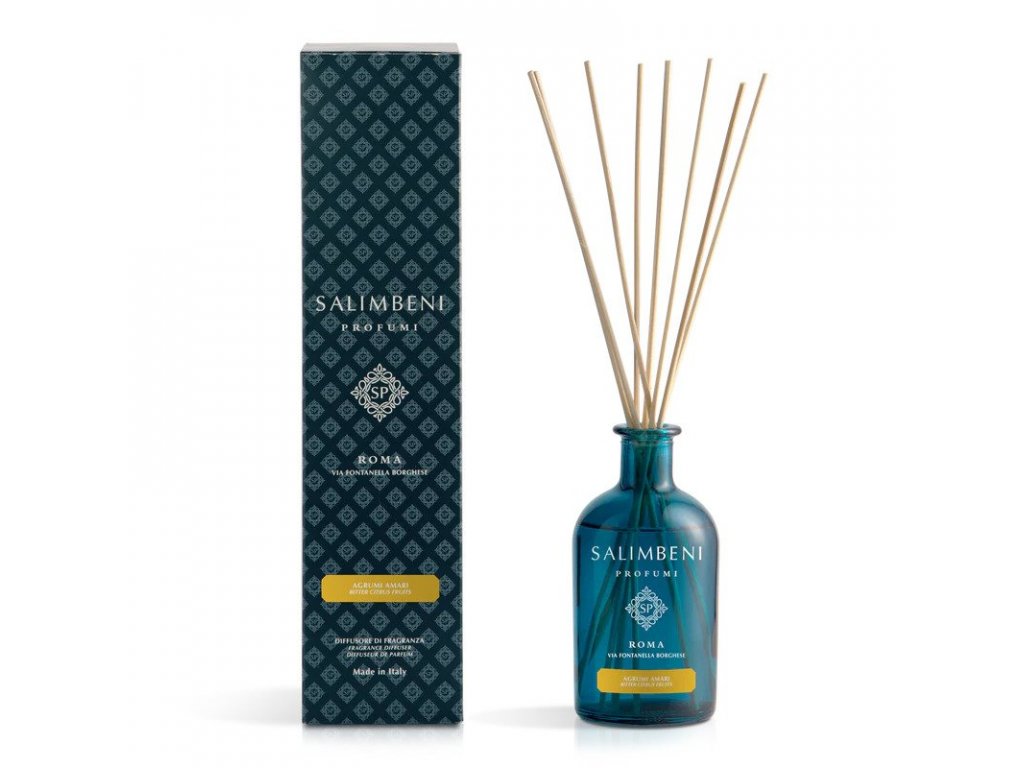 Aróma difuzér Horký Citrus značky Salimbeni Profumi Roma. Kompozícia vôni charakterizovaná zaujímavými kontrastmi: Citrusové a kvetinové. Hravé aromatické vône charakterizujú srdcové tóny, zmiernené vodnými tónmi. Jantár, pačuli, biely pižmový charakter a vetiver zastupujú základné tóny.