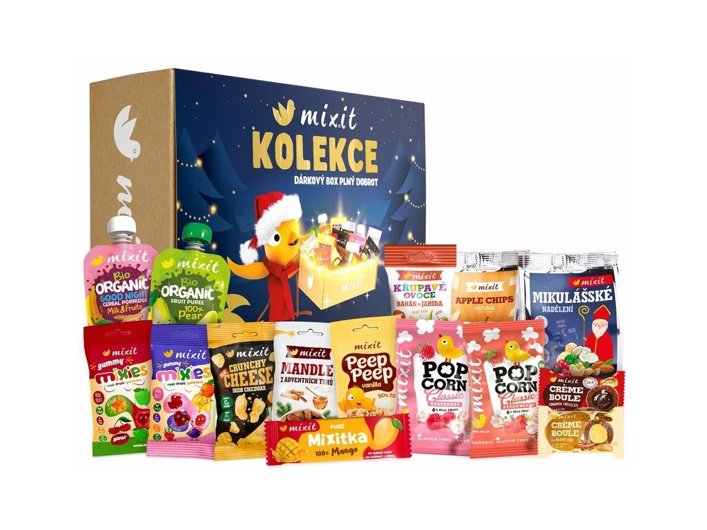 1x Ovocná Mixitka – 100% Mango: sušené mango 100%. 1x Jablčné chipsy – Natural do vrecka: sušené jablká 100%. Môže obsahovať stopy lepku, mlieka, škrupinových plodov, arašidov, sezamu a sóje. 1x Mandle z adventných trhov do vrecka: pražené a karamelizované mandle s medom a škoricou 100 % (mandľa 66,3 %, cukor 30%, med 2 %, mletá škorica 1,2 %, repkový olej 0,5%). 1x Mikulášske nadelenie do vrecka: klikva 17 % (kľučka " brusnica kanadská" 65 %, Cukor, slnečnicový olej), jadra kešu orechov 15%, sušené figy 14 % (figy 97 %, ryžová múka), mandle lúpané pražené 12%, sušené datle 12%, pražené mandle 12%, kokosové plátky 10 %, medový banán 8 % (banán 70 %, cukor 17 %, kokosový olej, med 2 %, banánovej aróma). 1x Mixit BIO vrecko – Good night: bio banánové pyré 34%, bio mlieko 30%, voda, bio broskyňové pyré 11%, bio ovsené vločky 7%, bio repkový olej 2%. 1x Mixit BIO ovocné vrecko – 100% Hruška: bio hruškové pyré 100%. 1x Vianočné Crème boule à la vaječný likér: sušené datle 59%, krém s príchuťou vaječného likéru 30% (cukor, slnečnicový olej, kokosový olej, kakaové maslo, sušené mlieko, sušená srvátka, emulgátor: slnečnicový lecitín; prírodné farbivo: luteín; prírodná aróma), múka z kešu orechov, strúhaný kokos, zmes korenia 0,6 % (cejlónska škorica, klinček, badián). Môže obsahovať stopy iných škrupinových plodov, arašidov a sóje. 1x Crème hrče – Cinnamon Chocolate: sušené datle 56,1%, lieskovoorieškový krém 33,3% (pražené jadrá lieskových orieškov z Piemontu I. ). G. P. 20 %, hnedý cukor, kakaový prášok so zníženým obsahom tuku, slnečnicový olej, plnotučné sušené mlieko, kuchynská soľ, emulgátor: sójový lecitín; prírodný vanilkový extrakt), mleté jadrá kešu orechov 7,9 %, strúhaný kokos 2,1 %, zmes korenia 0,6 % (škorica, klinček, badián). Môže obsahovať stopy lepku, iných škrupinových plodov, sezamu, arašidov a časti kôstok. 1x Ovocné Mixies - Jablko & čerešňa - prírodné želé cukríky: ovocné šťavy a pyré 96,5 % (koncentrovaná jablčná šťava 63,3 %, koncentrované jablčné pyré 26,2 %, koncentrovaná citrónová šťava 4 %, čerešňové pyré 2,5 %, koncentrovaná čerešňová šťava 0,5 %), želírujúca látka: pektín; koncentrovaná šťava z čiernej mrkvy, regulátor kyslosti: citrát tridraselný; prírodná aróma, citrusová vláknina. Môže obsahovať stopy lepku, mlieka, škrupinových plodov, arašidov, sezamu a sóje. 1x Ovocné Mixies – Malina, čučoriedka, pomaranč – prírodné želé cukríky: ovocné šťavy a pyré 96,2 % (koncentrovaná jablčná šťava, koncentrované jablčné pyré, malinové pyré 3,6 %, čučoriedkové pyré 1,4 %, koncentrovaná pomarančová šťava 1,1 %, jahodové pyré 1 %, černicové pyré 1 %, čerešňové pyré 1 %, koncentrovaná čučoriedková šťava 0,5 %), želírujúca látka: pektín; koncentrovaná citrónová šťava, citrusová vláknina, koncentrovaná šťava z čiernej mrkvy, prírodná aróma, regulátor kyslosti: citrát tridraselný; pomarančový olej. Môže obsahovať stopy lepku, mlieka, škrupinových plodov, vajec, oxidu siričitého a sóje. 1x Chrumkavý syr do vrecka – Írsky cheddar: syr cheddar 100% (pasterizované kravské mlieko, jedlá soľ, mliekarske kultúry, mikrobiálne syridlo). Tuk v sušine min. 51%. 1x Cereálie Peep Peep – Vanilka do vrecka: vanilkové vtáčiky (pšeničná múka* 60 %, koncentrovaná datľová šťava* 17 %, ryžová múka* 15 %, kukuričná múka*, prírodná vanilková aróma, mletá bourbonská vanilka* 0,05 %; *zložky z kontrolovaného ekologického pestovania). Môže obsahovať stopy mlieka, škrupinových plodov, arašidov, sezamu a sóje. 1x Chrumkavé ovocie do vrecka – Banán a jahoda: Lyofilizované ovocie (banán 65 % a jahody 35 %). Môže obsahovať stopy lepku, mlieka, škrupinových plodov, arašidov a sóje. 1x BIO popcorn – Malina do vrecka (13 g): BIO kukurica* 59 %, BIO slnečnicový olej*, BIO trstinový cukor*, BIO malinový prášok* 6 %. *Surovina z certifikovaného ekologického poľnohospodárstva. 1x BIO popcorn – Jahoda do vrecka (13 g): BIO kukurica* 59 %, BIO slnečnicový olej*, BIO trstinový cukor*, BIO jahodový prášok* 6 %. *Surovina z certifikovaného ekologického poľnohospodárstva.