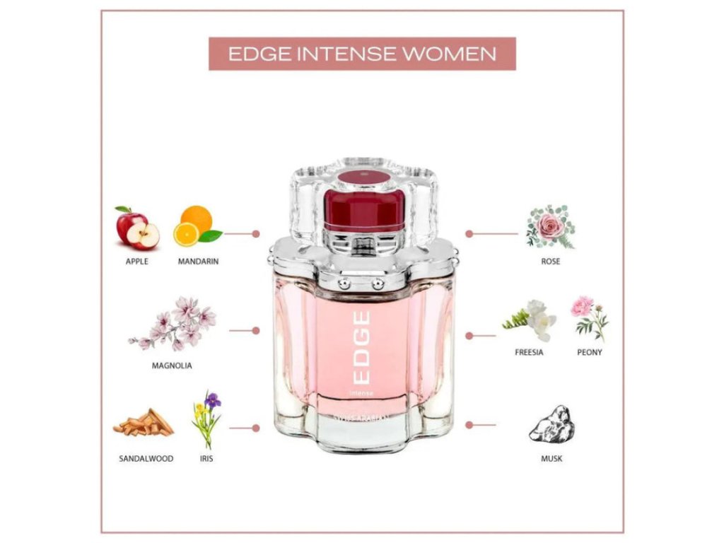 Parfumovaná voda Swiss Arabian Edge Intense 100 ml je žiarivá a výrazná vôňa vytvorená pre ženy , ktoré vyžarujú energiu, sebavedomie a ženskosť. Táto parfumovaná voda spája šťavnaté ovocie, svieže kvety a jemný pižmovo-drevitý základ do vône, ktorá pôsobí povznášajúco, elegantne a bez námahy moderne.